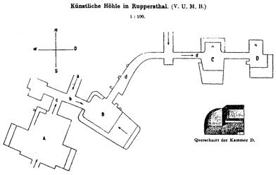 Die Gänge sind manchmal stark gewunden oder winkelig‚ 60 bis 70 cm breit und nur selten höher als 1‚30 m‚ manchmal nur kriechend oder gar am Bauch schliefend zu befahren. Oft gibt es Niveauunterschiede mit meist schlupflochartigen Auf- bzw. Abstiegen zwischen den Etagen. Häufig sind Kammern eingebaut‚ deren Grundfläche maximal 2 x 3 m‚ meist aber weniger‚ beträgt. In manchen Kammern hat man "Sitzbänke" aus dem Löss- oder Steinmaterial herausgearbeitet.